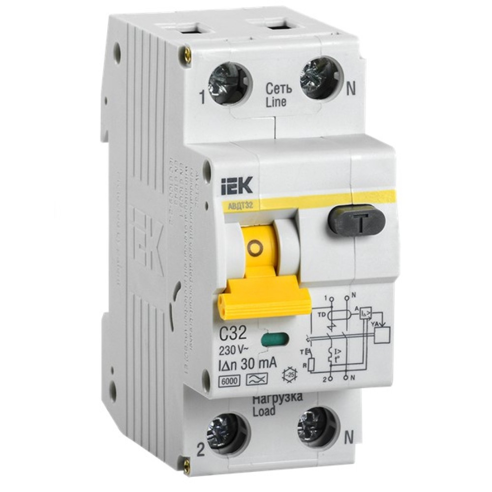 Автоматический выключатель дифференциального тока АВДТ32 C32А/30мА IEK (артикул MAD22-5-032-C-30) предназначен для защиты человека от поражения электрическим током при повреждении изоляции электроустановок, для предотвращения пожаров вследствие протекания токов утечки на землю и для защиты от перегрузки и короткого замыкания.