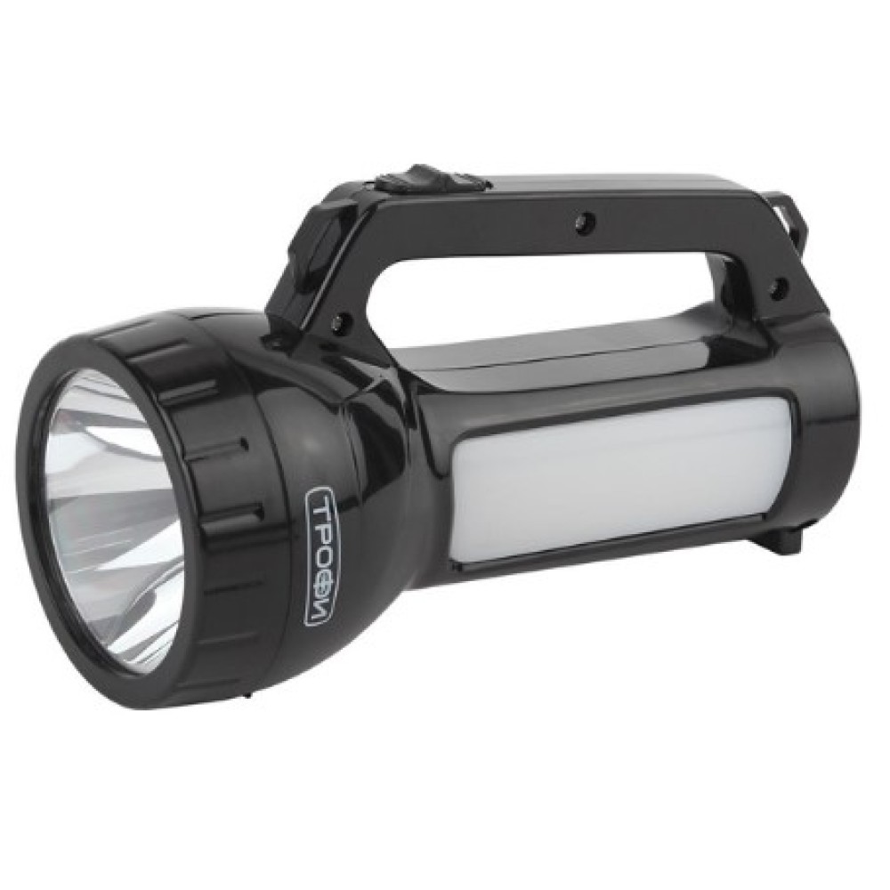 Трофи PA-504 – ручной аккумуляторный фонарь с боковым светильником. Во фронтальной части установлен мощный SMD-диод с дальним направленным светом, светильник состоит из 12 светодиодов с заливающим ближним светом. Для работы фонаря не требуются батарейки, одной подзарядки устройства хватает на 4 часа непрерывной работы. Эргономичная ручка, кнопка включения прямо под большим пальцем. С помощью этого простого в управлении фонаря можно эффективно освещать путь или организовать освещение на привале, поставив Трофи PA-504 на ровную поверхность в качестве настольного светильника.