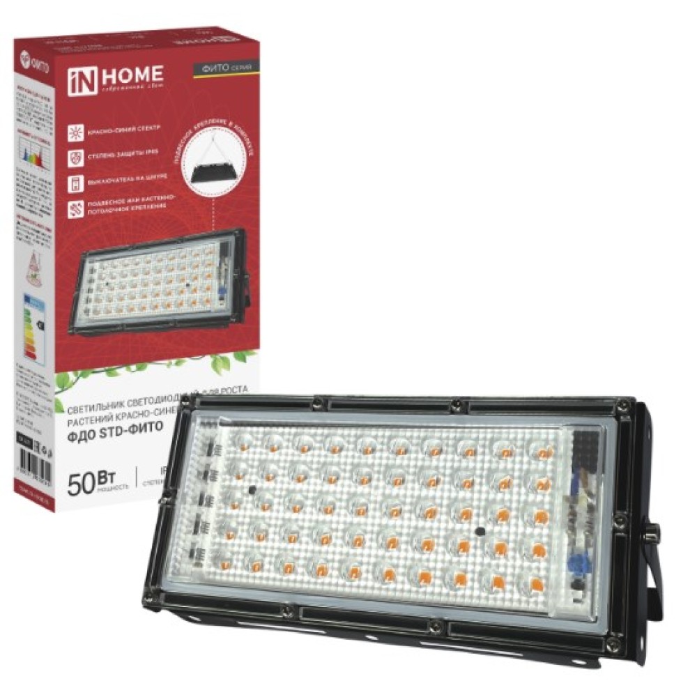 Прожектор светодиодный ФДО STD-ФИТО с красно-синим спектром мощностью 50 Вт и степенью защиты IP65 от бренда IN HOME предназначен для ускорения роста растений. Он сочетает красный свет, стимулирующий рост зелёной массы, и синий, укрепляющий корневую систему. Устройство подходит для использования в парниках, теплицах и оранжереях благодаря влагозащите IP65.