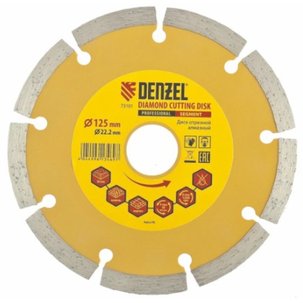 Отрезной сегментный алмазный диск Denzel 73101 диаметром 125 х 22,2 мм — оснастка для УШМ, использующаяся для сухой резки свежего и старого бетона, камня, кирпича, шлакоблока, мрамора, тротуарной плитки, гранита.