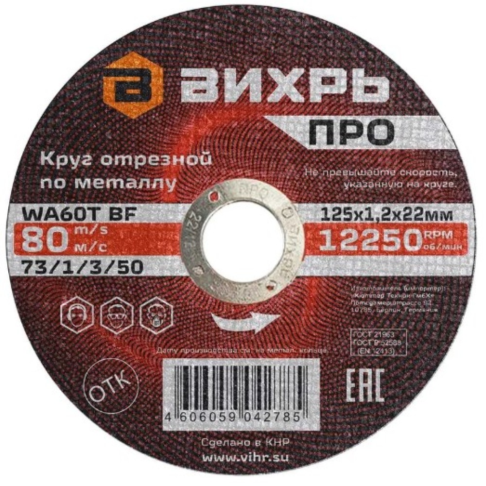 Круг отрезной по металлу Вихрь ПРО 125х1,2х22 мм (артикул 73/1/3/50) предназначен для резки металлических заготовок с помощью угловых шлифовальных машин (болгарок). Диск можно использовать при скорости до 12 250 оборотов в минуту.