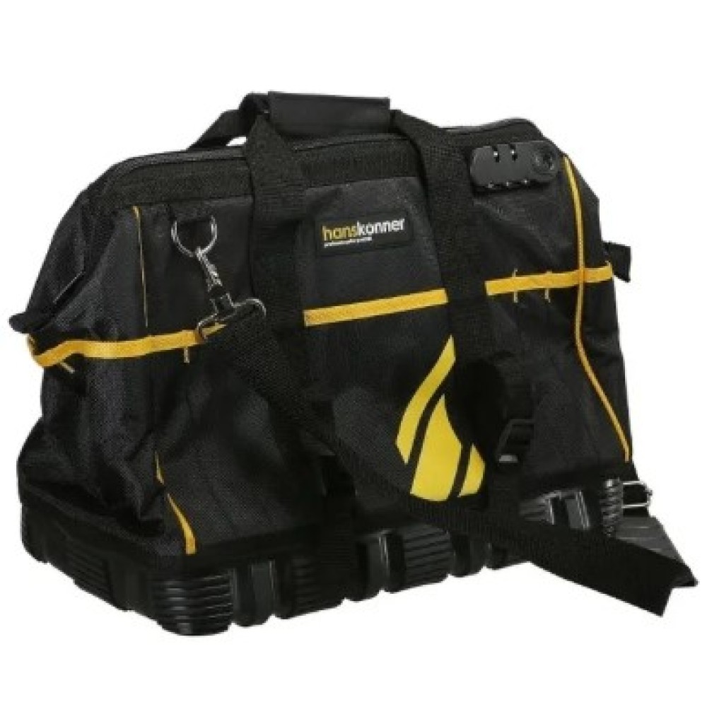 Сумка для инструментов, код. замок, 38 карманов, пластиковое дно, Hanskonner HKTB0138 - Оснащена кодовым замком для безопасного хранения инструмента внутри. 100% полиэстер выдерживает нагрузку в 30 кг, устойчив к растяжению и стиранию. Дополнительные вставки в стенки сумки позволяют ей лучше держать эргономичную форму при переноске инструментов. Быстрая широкая молния позволяет мгновенно открыть сумку и получить доступ к инструменту. Съёмная перегородка во внутреннем отделе сумки помогает зонировать пространство для инструмента, а так же сама снабжена карманами. Возможность её снятия позволяет полностью контролировать эргономику хранения инструмента.