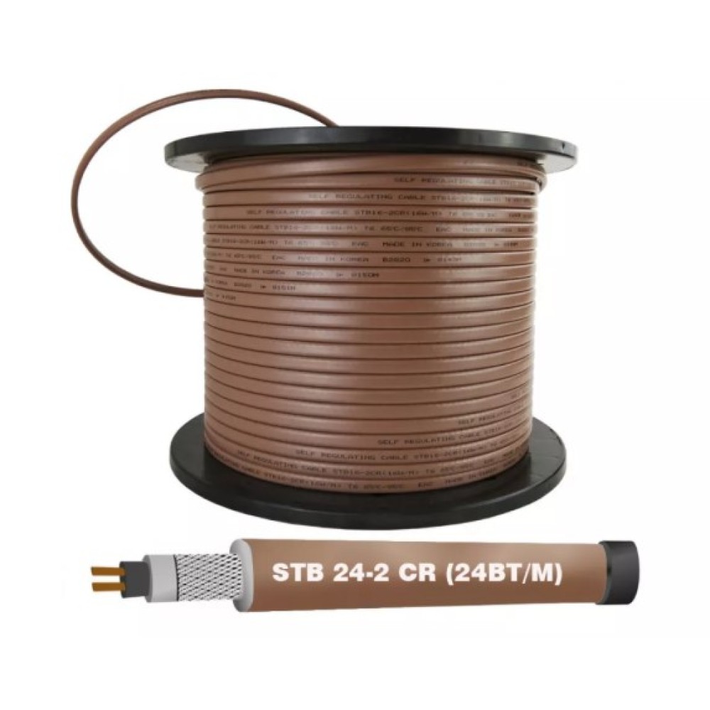 Саморегулирующийся нагревательный кабель STB24-2CR , где 24Вт - линейная мощность на 1 м.пог. кабеля ( в наличии варианты с большей мощностью : STB16-2CR и STB30-2CR) а 2CR - говорит о том, что кабель двухжильный с медной оплёткой, выполняющей роль заземления и дополнительную защиту от механических повреждений) STB24-2CR-это современный, надежный и универсальный источник тепловой энергии для защиты, труб, ливневых и канализационных систем от промерзания в холодное время года.