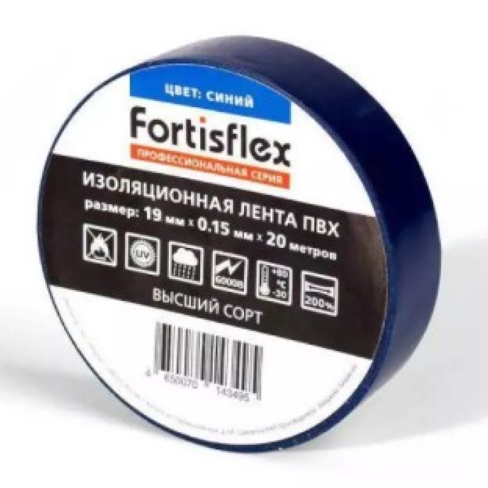 Изолента ПВХ синяя 19х0.15x20 Fortisflex предназначена для изоляции, жгутирования и маркировки при выполнении электромонтажных работ.
