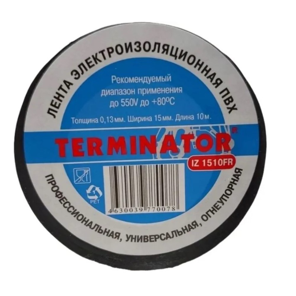 Изолента ПВХ Терминатор проф. огнеупорная черная 0,13х15мм, 10м (-10- +80гр)